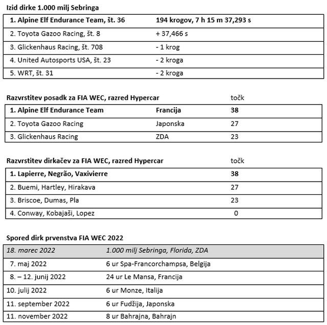 André Negrão se je vrnil na čelo in odpeljal dve izmeni, preden je v mraku in pod grozeče temnim nebom v dirkalnik spet sedel Matthieu Vaxiviere. Francoz se je čudežno ohranil na čelu med nevtralizacijami in pred drugo prekinitvijo zaradi nevihte, ki je zajela dirkališče le dobro uro pred predvidenim koncem dirke. Ko je bilo vse pripravljeno za nadaljevanje dirke, je bil postopek novega starta prekinjen le slabo uro pred njenim zaključkom. Ta odločitev je pomenila nepreklicen konec dirke 1.000 milj Sebringa pred zgornjo časovno mejo osmih ur in je zapečatila prvo zmago moštva Alpine Elf Endurance po povratku znamke v najvišji razred vzdržljivostnega dirkanja. Alpine je s prvim startnim mestom in zmago osvojila največje možno število točk za svetovno prvenstvo, v katerem je seveda po prvi dirki na prvem mestu. To vodstvo si bo Alpine prizadevala ubraniti v naslednji dirki FIA WEC, ki bo od 5. do 7. maja v Spa-Francorchampsu v Belgiji.