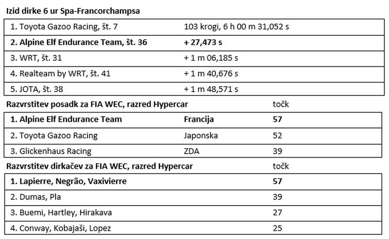 Po polovici dirke je Brazilec dirkalnik predal Nicolasu Lapierru, ki je po več prekinitvah z varnostnim avtomobilom oziroma rdečo zastavo naposled najbližjega tekmeca ujel, potem pa izkoristil obdobje rumene zastave, da je volan prepustil Matthieuja Vaxiviera. Najmlajši član posadke je prišel na drugo mesto in potem naredil vse, da je obdržal pritisk na vodilne, za zadnjo uro dirke pa zavil v boks po gladke pnevmatike. Kljub vsem prizadevanjem je Matthieu Vaxiviere z Alpine A480 v cilj pripeljal na drugem mestu, z manj kot pol minute zaostanka za zmagovalci. Ta druga uvrstitev na zmagovalni oder letos in skupno osma zapored v najvišjem razredu je moštvu s puščičasto črko A dober mesec pred slovito dirko 24 ur Le Mansa zagotovila ohranitev vodstva v skupni razvrstitvi za letošnje svetovno vzdržljivostno prvenstvo FIA.