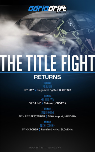 Drift scena v regiji gre znova stopničko višje. Po letu premora se namreč vrača Adria Drift Series, največji in najmočnejši drifterski spektakel, doma v tem delu Evrope. To pomeni tudi povratek približno 50 voznikov iz 8 držav, ki bodo letos divji ples z avtomobili pod okriljem tega tekmovanja uprizorili v Sloveniji, na Hrvaškem in na Madžarskem. Izredno smo veseli, da se na koledar vrača Meka slovenskega drifta – Blagomix Logatec, kjer bo že v nedeljo, 19. maja, izpeljan Kick Off oziroma otvoritvena dirka 4. sezone. Organizatorji obljubljajo izjemno atraktivno postavitev steze, na kateri bo do izraza prišla moč dirkalnikov. Ta bo letos v povprečju presegala 450 konjskih moči, najmočnejši pa bodo pod motornim pokrovom skrivali tudi preko 700 'konjev.'
