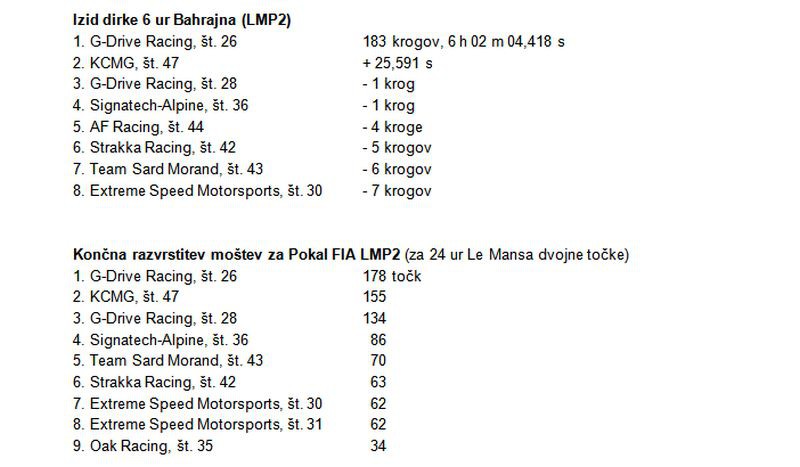 - Po drugem mestu v dirki na Japonskem in zmagi na Kitajskem so v zadnji dirki sezone v Bahrajnu Nelson Panciatici, Paul-Loup Chatin in Tom Dillmann z Alpine A450b osvojili četrto mesto.