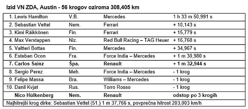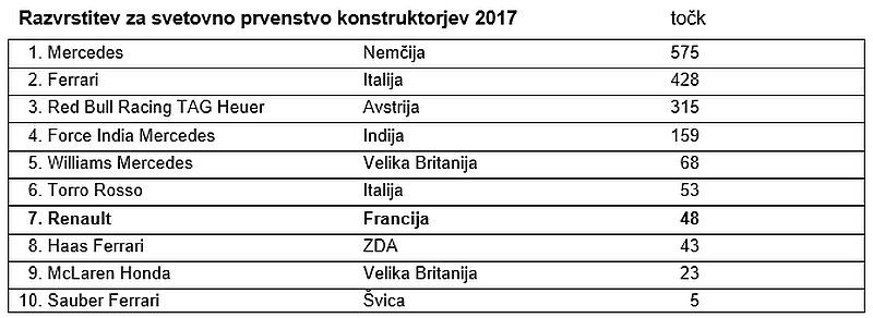 Moštvo Renault Sport Formula One se je po izvrstnem prvem nastopu Carlosa Sainza v rumeno-črnem dirkalniku povzpelo nazaj na sedmo mesto v skupni razvrstitvi za svetovno prvenstvo konstruktorjev. Sainz je v cilj pripeljal sedmi, a si je prizadeval osvojiti šesto mesto, s čimer bi izenačil najboljšo uvrstitev moštva letos. Nico Hülkenberg je imel manj sreče, čeprav je startal zelo dobro, saj je bil zaradi padca tlaka olja prisiljen odstopiti že kmalu po začetku dirke.