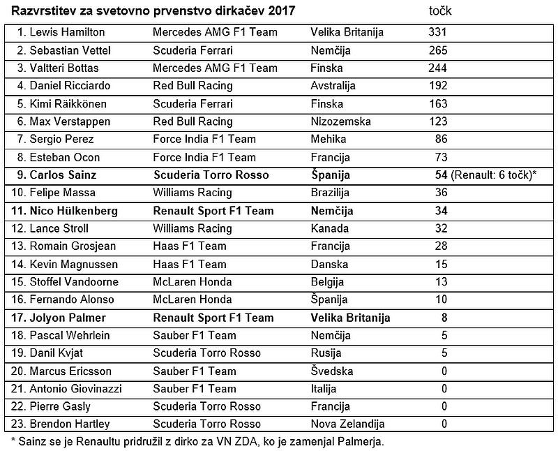 Carlos Sainz, št. 55, R.S. 17-03, 7. startno mesto, 7. mesto v dirki: “To je bil zame krasen prvi nastop z Renaultom in v dirki sem prav užival. Od začetka sem z vsakim krogom pridobival zaupanje v dirkalnik in ga zato lahko vedno bolj gnal. Lahko sem napadel oba dirkalnika moštva Force India, ki sta bila v minulih nekaj dirkah za moštvo izven dosega, zato je bilo krasno, da sem enega lahko prehitel, drugega pa vsaj preganjal. Ves konec tedna je potekal gladko; vedel sem, da bom lahko hiter in ni mi manjkalo samozavesti. Celotno moštvo mi je zelo pomagalo, kar je bilo ključnega pomena za naglo prilagajanje. Zelo sem vesel tako uspešnih kvalifikacij in dirke, zato sem iskreno hvaležen prav vsakomur v moštvu.”