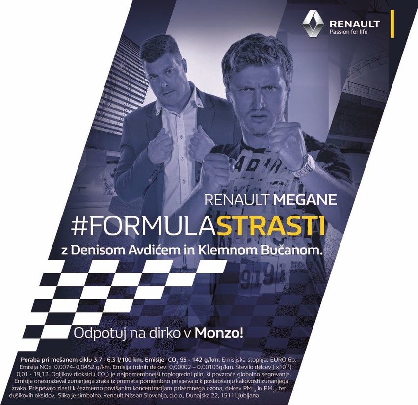 Zgovorna Denis Avdić in Klemen Bučan bosta ta teden na slovenskih cestah v jutranjih urah zapeljevala ljudi. Renault Mégane bo njuno prepričevalno orožje v iskanju tričlanskih ekip, ki se bodo pomerile za ogled dirke v Monzi! Včeraj sta Radio 1 in Renault zagnala »Formulo strasti« - posebni projekto, katerega vrhunec bo odhod tričlanske zmagovalne ekipe na nepozaben ogled dirke v Monzi.