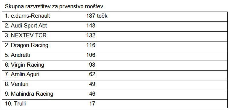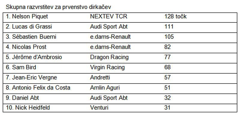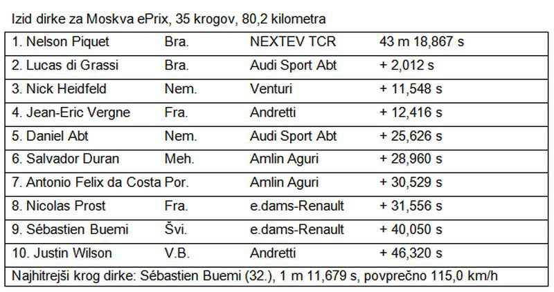 Moskva je bila minulo soboto predzadnja postaja prvenstva FIA formule E in prizorišče druge zmage Nelsona Piqueta (Nextev TCR) v sezoni. Brazilec je z zmago še povečal svojo prednost v skupni razvrstitvi, katere vrh je enak kot izid moskovske dirke: drugi je bil Lucas di Grassi (Audi Sport Abt), tretji pa Sébastien Buemi (e.dams-Renault). Slednji je po dirki dobil 29 sekund kazenskega pribitka in je zato v uradni razvrstitvi zdrsnil na deveto mesto. Kljub temu je moštvo e.dams-Renault z Buemijevo uvrstitvijo in najhitrejšim krogom dirke ter Prostovim osmim mestom osvojilo toliko točk, da ima pred zaključnima dirkama, ki bosta konec meseca v Londonu, solidno prednost v skupni razvrstitvi moštev.
