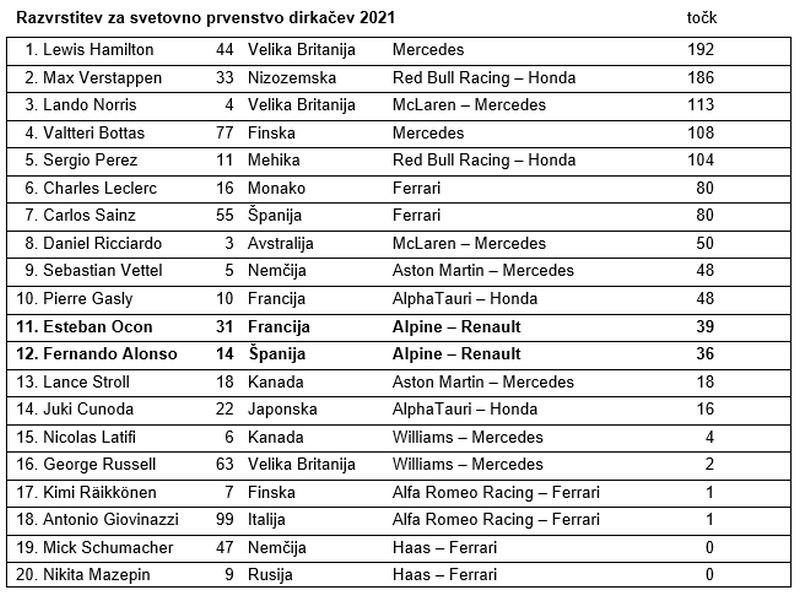 Esteban Ocon (8. startno mesto, 1. mesto v dirki): »Zmagovalec Velike nagrade v formuli 1 je neverjetno in tega še vedno nisem dojel v celoti. Kakšen trenutek, allez les bleus! Dirka je bila nora od starta do cilja. Odločati se je bilo treba o mnogih prilagoditvah in moštvo je to res odlično opravilo, prav tako tudi ekipa, ki je poskrbela za izvrstna postanka v boksu, kar je bilo ključno, da sem ostal pred Sebastianom [Vettlom]. Z zadovoljstvom sem po najboljših močeh nadziral ritem vožnje na čelu in vse se je dobro izšlo. In kakšen boj je pokazal Fernando s svojo čudovito pomočjo v zaključnem delu, s katero je ogromno prispeval k zmagi, in lepo je bilo deliti veselje z njim. Ne morem se dovolj zahvaliti za prizadevnost in podporo vsega moštva in vse to je bilo danes poplačano. Velika zahvala tudi vsem v Enstonu in Viryju – ta zmaga je vaša!«