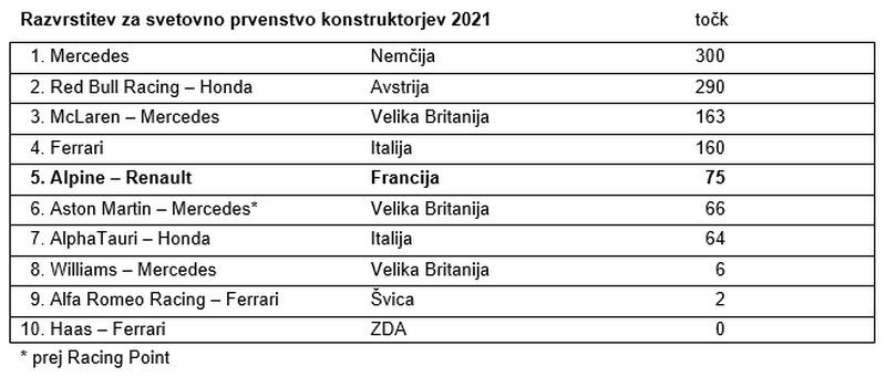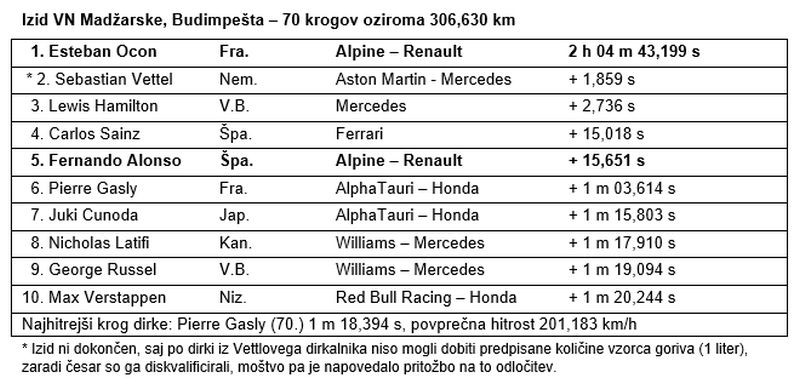 Moštvo Alpine F1 je prvo zmago v formuli 1 na Hungaroringu osvojilo zahvaljujoč osupljivi vožnji Estebana Ocona, za katerega je bila to prav tako prva zmaga v formuli 1. Fernando Alonso je po nekaj neustrašnih bojih v cilj pripeljal na četrtem mestu, kar pomeni, da je moštvo pred poletnim premorom napredovalo na peto mesto razvrstitve za svetovno prvenstvo konstruktorjev.