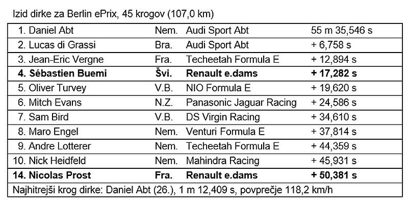 Moštvo Renault e.dams je v dirki za Berlin ePrix, ki je spet potekala na opuščenem mestnem letališču Tempelhof, pokazalo svoj borbeni duh. Sébastien Buemi se je skozi vso dirko boril za uvrstitev na stopničke, v cilj pa pripeljal na četrtem mestu.