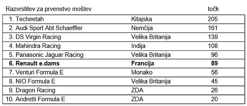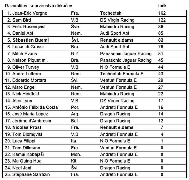 Zahvaljujoč najhitrejši zamenjavi dirkalnika med vsemi dirkači se je Buemi po vrnitvi na stezo znašel pred Francozom. Prost je imel v tej fazi dirke več smole, saj ga je ob izvozu iz boksa oviral promet, zaradi česar je izgubil dobrih osem sekund in nekaj mest. Drugi del dirke je bil enako razburljiv, saj sta Buemi in Vergne zmanjšala svoj zaostanek za Turveyem. Ko je Buemi prehitel Britanca, mu je Vergne sledil in to priložnost izkoristil, da se je po notranji strani prerinil na tretje mesto. Buemi je tako ostal četrti vse do cilja. Zaključni krogi niso prinesli nobene spremembe pri vrhu, se je pa Nicolas Prost prebijal naprej za po eno mesto na krog in ciljno črto prevozil kot štirinajsti. Po deveti dirki sezone je moštvo Renault e.dams v skupni razvrstitvi še vedno na šestem mestu z 89 točkami. V skupni razvrstitvi dirkačev je Buemi z 82 točkami nazadoval na peto mesto, vendar ga od tretjega ločuje le 4 točke razlike.