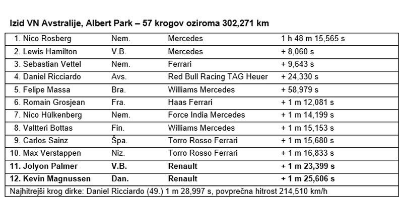 Moštvo Renault Sport Formula One je svojo novo pustolovščino v formuli 1 začelo s solidnim uvodom v Albert Parku, kjer je Jolyon Palmer v cilj pripeljal pred Kevinom Magnussenom in na robu uvrstitve za točke. Palmer je kljub temu, da je bila to njegova prva dirka formule 1, dirkal zrelo, se v zaključnem delu upiral pritisku in čez ciljno črto pripeljal na enajstem mestu. Kevin je imel v prvem krogu smolo s predrto pnevmatiko, a je potem napredoval in se zlasti v zaključnem delu izkazal s posebno hitro vožnjo ter v cilj pripeljal na dvanajstem mestu.