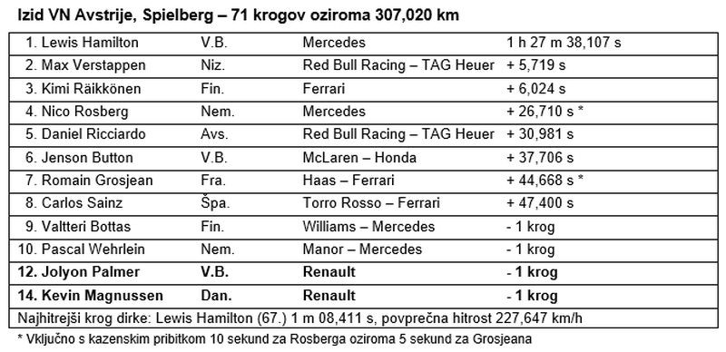 Moštvo Renault Sport Formula One Team je dirko za VN Avstrije končalo z boljšima uvrstitvama kot v kvalifikacijah, saj je Jolyon Palmer, ki je dirko začel z 20. startnega mesta, v cilj pripeljal dvanajsti in se močno približal uvrstitvi za točke. Kevin Magnussen pa je dirko začel s 17. startnega mesta, v cilj pa je pripeljal štirinajsti. Oba dirkača sta napredovala kljub posegu varnostnega avtomobila sredi dirke, ki je skazil strategijo rabe pnevmatik, in kazenskim petim sekundam za Magnussena zaradi oviranja tekmeca.