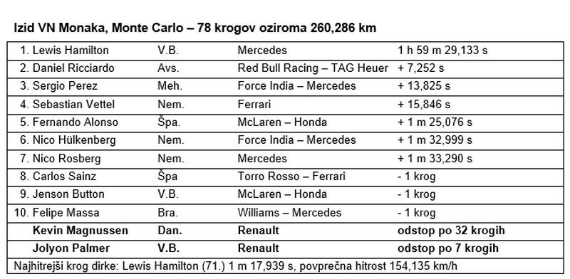 Moštvo Renault Sport Formula One Team je z odstopoma obeh dirkačev pestro dirko za VN Monaka zaključilo predčasno in z razočaranjem. Po uvodu dirke za varnostnim avtomobilom je Kevin Magnussen pokazal obetaven napredek z zgodnjim postankom in zamenjavo dežnih pnevmatik s prehodnimi za manj mokro stezo. Magnussenov nastop je skazil nerazumljiv napad Kvjata, ki je zaostajal za krog. Magnussen je dirko nadaljeval, a spet trčil v ogrado in moral odstopiti. Za Jolyona Palmerja je bila dirka veliko krajša, saj je na začetku osmega kroga na startni ravnini dirkalnik splaval, trčil v ogrado in se dokončno ustavil ob ogradi ovinka Sainte-Dévote.
