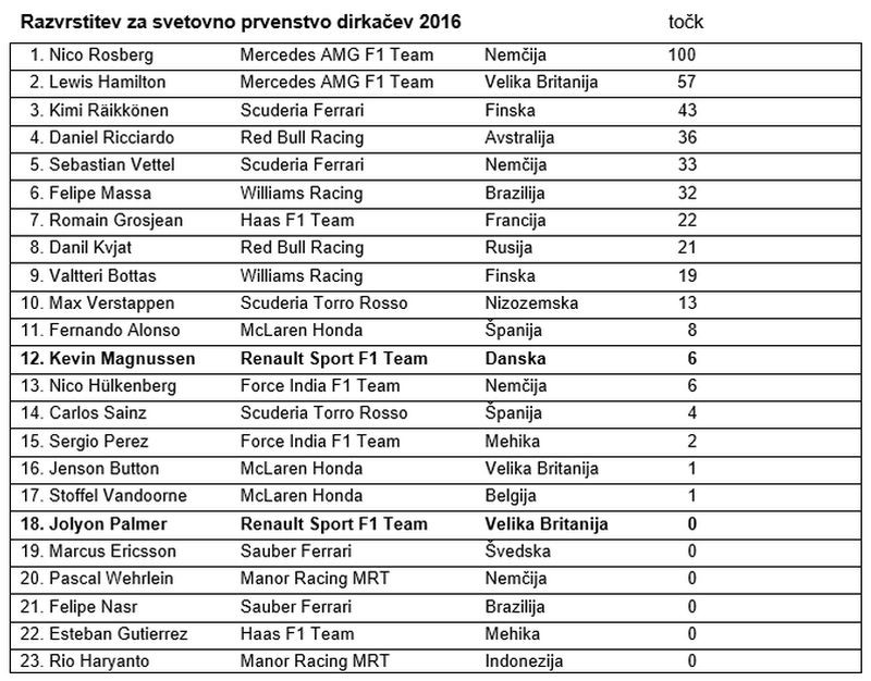 Jolyon Palmer, št. 30, R.S. 16-01: 18. startno mesto, 13. mesto v dirki: “Odlično, da je moštvo prišlo do svojih prvih točk v tej sezoni in veseli me, ker smo z dirkalnikom R.S.16 že dosegli opazen napredek. Kevin je danes pokazal, kaj lahko dosežemo, to pa je dobra referenca za naslednje dirke. V celoti smo ta konec tedna spoznali kar nekaj pozitivnih stvari, zato menim, da imamo veliko poti za razvoj in napredek za naslednje dirke.”