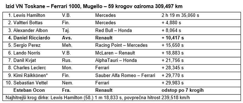 Daniel Ricciardo iz moštva Renault DP World F1 je bil s četrtim mestom na pragu vzpona na zmagovalni oder po razburljivi in zapletov polni dirki za Veliko nagrado Toskane v Mugellu, ki jo je dvakrat umiril varnostni avto, dvakrat pa je bila prekinjena z rdečo zastavo. Esteban Ocon je odstopil zaradi težav z zavorami. Ricciardo je čez ciljno črto pripeljal le 2,4 sekunde za tretjeuvrščenim po 59 krogih utripajoče dirke, ki je trajala skoraj poltretjo uro, je bila prekinjana zaradi nesreč in zato imela dodatna stoječa starta.
