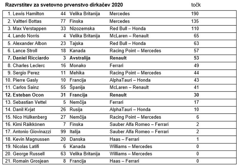 Daniel Ricciardo, št. 3, 8. startno mesto, 4. mesto v dirki: »Prav zadovoljen sem z današnjo dirko in spet smo tako blizu uvrstitvi na zmagovalni oder. Za nami je dolg dan in dolga dirka s prekinitvami in nesrečami, a poglavitno je, da so vsi dirkači ostali nepoškodovani. Proti koncu dirke je že kazalo, da bomo osvojili tretje mesto, zato je prav škoda, da nam je zmanjkalo tako malo. Ne moremo priti bližje kot toliko in še naprej si bomo prizadevali, da nam vendarle uspe. Naši starti so bili dobri, prehiteli smo Valtterija [Bottasa], a sta bila on in Alex [Albon] enostavno prehitra, da bi ju lahko zadržal. Po vsem skupaj malo boli, da nismo na odru, a današnje četrto mesto je vendarle zelo dobra uvrstitev.«