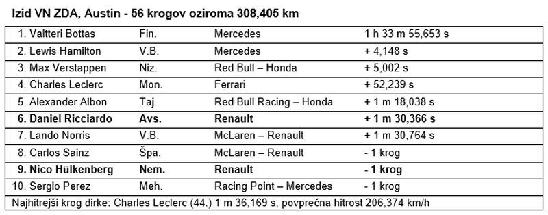 Moštvo Renault F1 je v razburljivi dirki za VN ZDA v Austinu (Teksas) osvojilo deset točk, saj sta se Daniel Ricciardo in Nico Hülkenberg uvrstila na šesto oziroma deveto mesto. Daniel Ricciardo je startal zelo dobro in se z devetega startnega mesta do konca drugega kroga prebil na šesto mesto. Po vztrajnem dvoboju z Landom Norrisom je Ricciardo mladega Britanca prehitel v osmem krogu in bil do 21. kroga peti. Po 21 krogih je zavil v boks in dobil trde pnevmatike, s katerimi naj bi z načrtovano strategijo enega samega postanka pripeljal do cilja dirke. Ricciardo je bil že dva kroga po postanku spet peti, dokler ga ni prehitel Albon, v zadnjem delu dirke pa se je uspel ubraniti napadov Landa Norrisa.