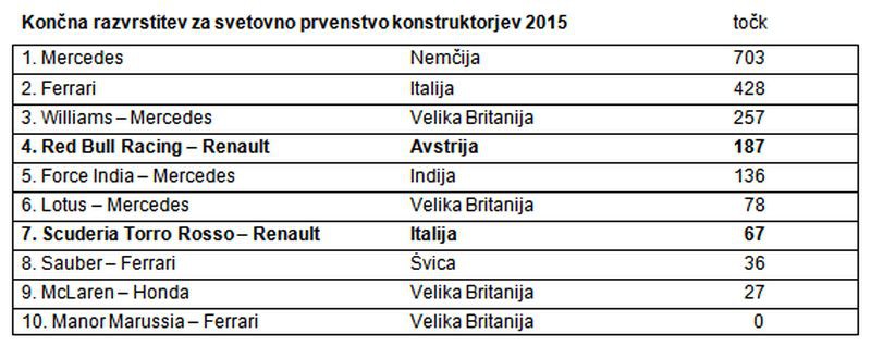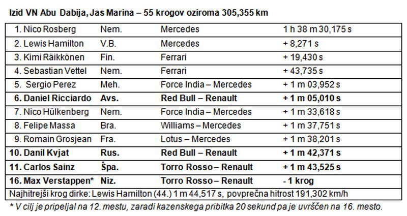 Pod žarometi dirkališča Jas Marina se je z dirko za VN Abu Dabija zaključilo letošnje svetovno prvenstvo formule 1. Moštvo Red Bull Racing je sezono končalo z dvojno uvrstitvijo za točke, saj je Daniel Ricciardo v cilj pripeljal na šestem, Danil Kvjat pa na desetem mestu. Kljub zelo odločni vožnji obeh dirkačev, ki sta se pogumno borila vso dirko, jo je moštvo Toro Rosso zaključilo na samem pragu točk, saj je bil Carlos Sainz v cilju enajsti, Max Verstappen pa dvanajsti.* Moštvo Red Bull Racing je sezono zaključilo na četrtem mestu v razvrstitvi moštev, Scuderia Toro Rosso pa na sedmem mestu.