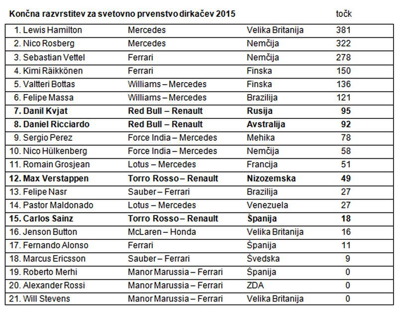 * Po kazenskem pribitku po dirki je uvrščen na 16. mesto.