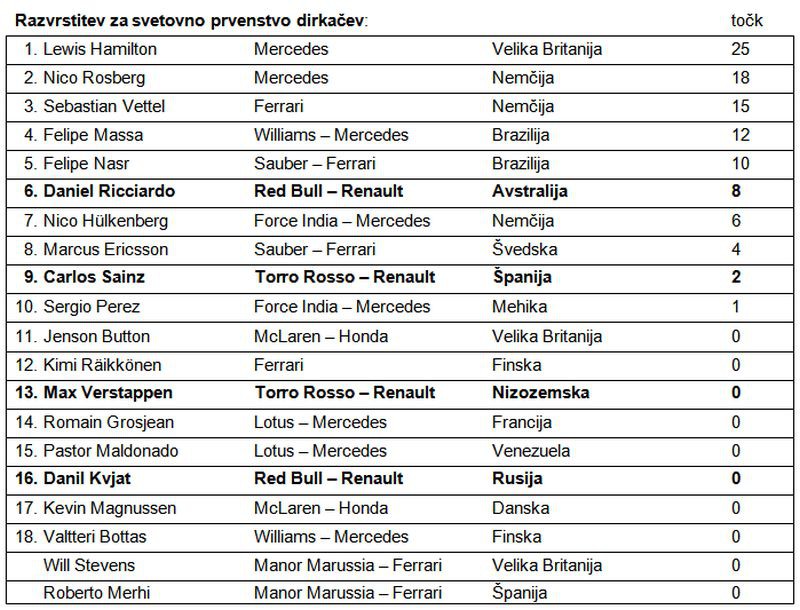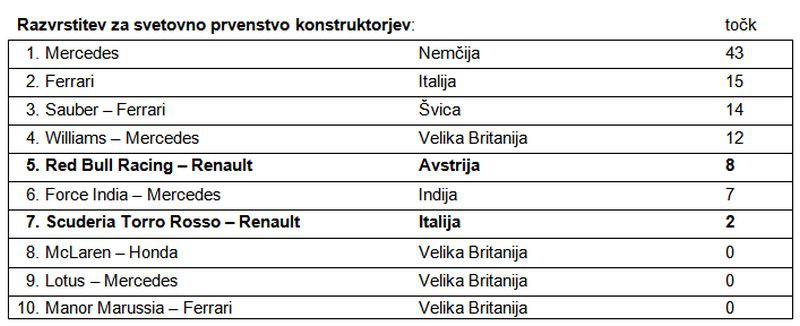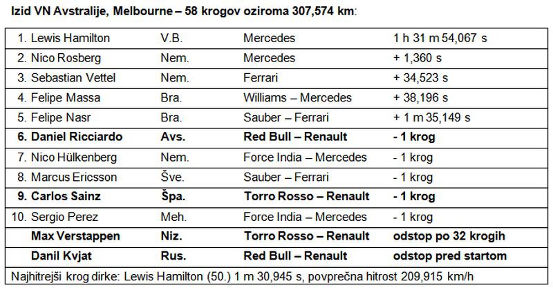 Daniel Ricciardo iz moštva Red Bull Racing je v dirki za VN Avstralije že osvojil prve točke za letošnje svetovno prvenstvo. Avstralec je uvodno dirko končal na šestem mestu. Njegov moštveni tovariš Danil Kvjat je sezono začel z razočaranjem, saj je imel že v formacijskem krogu težave z menjalnikom in je obstal že pred startom dirke.
