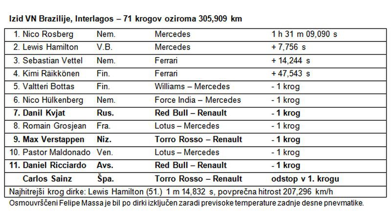 - Max Verstappen iz moštva Toro Rosso pokazal spretnost in borbenost, saj se je vso dirko s Sergiom Perezom (Force India) in obema dirkačema Lotusa boril za mesta, ki prinašajo točke. V 32. krogu je Pereza prehitel z osupljivim manevrom v dvojnem ovinku Senna tako za startno ravnino, le nekaj krogov za tem pa ga je prehitel Grosjean. Ponovno se je prebil v prvo deseterico, ko je v 68. krogu prehitel Pastorja Maldonada.