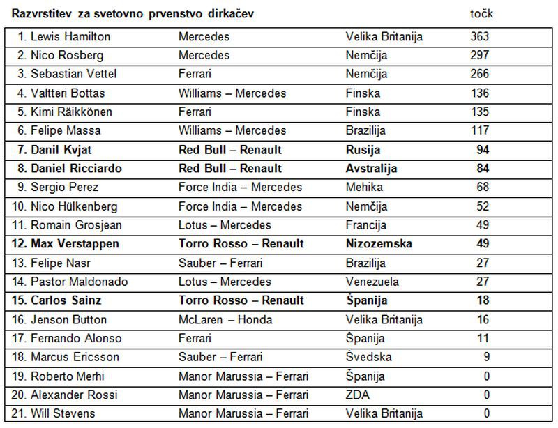 - Danil Kvjat je dirko začel s šestega startnega mesta, a ga je med pospeševanjem prehitel Bottas. Kasneje se je poskusil potegovati za šesto mesto in je Hülkenbergu sledil s slabo sekundo zaostanka, vendar ni našel poti mimo.
