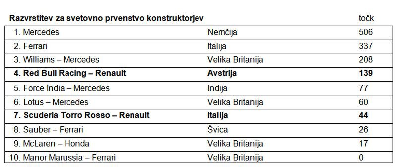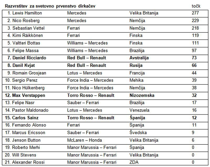 - Danil Kvjat je v cilj pripeljal trinajsti, čeprav je zaradi nesreče med kvalifikacijami moral dirko začeti izpred boksov. Napredoval je tudi s pomočjo domiselne strategije postankov.
