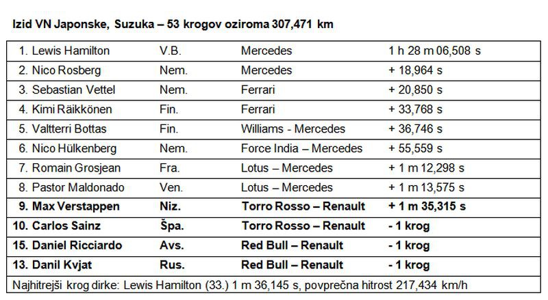 V dirki za VN Japonske v Suzuki je moštvo Torro Rosso z Renaultovimi pogonskimi sklopi doseglo dvojno uvrstitev za točke. Max Verstappen je dirko končal na devetem, njegov moštveni tovariš Carlos Sainz pa na desetem mestu. Moštvo Red Bull Racing je vzdržalo do cilja mnogim težavam navkljub. Danil Kvjat je dirko začel izpred boksov, a je dobro izkoristil strategijo zgodnjih postankov v boksu in do cilja napredoval na trinajsto mesto. Danielu Ricciardu je že kmalu po startu dirke počila pnevmatika in je na koncu v cilj pripeljal na petnajstem mestu.