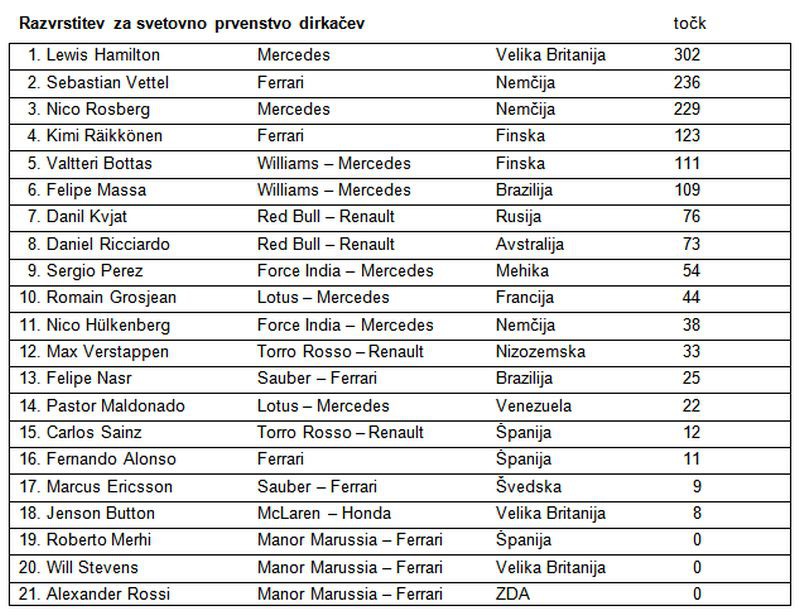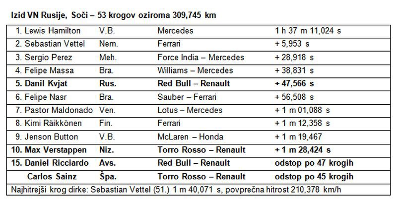 Danil Kvjat je z osvojitvijo šestega mesta v dirki za VN Rusije razveselil domače občinstvo. Dirkač moštva Red Bull Racing je zelo napeto dirko v svoji domovini, ki je bila polna zapletov in dvakrat prekinjena s posegom varnostnega avtomobila, zaključil z novo bero točk. Ta se je po dirki še povečala, saj je zaradi 30 sekund kazenskega pribitka Räikkönenu, v uradni uvrstitvi napredoval na peto mesto.