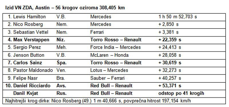Dirkališče Amerik (Circuit of the Americas - COTA) v Austinu je bilo prizorišče ene najbolj razburljivih dirk v novejši zgodovini formule 1. Razmočena in postopoma sušeča se steza je zagotovila številne napete boje med vsemi dirkači – od začelja do vodilne skupine.