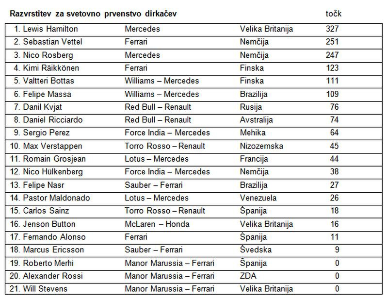 - Kvjat je v 41. krogu zapeljal čez rob steze. Zaradi razlike v oprijemu koles ga je zasukalo počez in zaneslo v ogrado, kar je zanj pomenilo dokončen konec dirke.