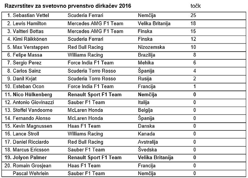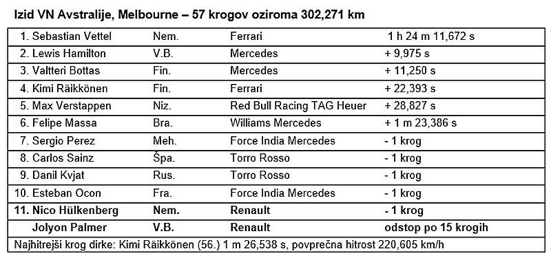 Jolyon Palmer, št. 30, R.S. 17-01, 19. startno mesto, odstop v dirki (zavore): “Moja dirka je sprva potekala dobro. Ob startu sem napredoval, čeprav sem imel najtrše pnevmatike. Moj ritem je bil kar soliden in pred seboj sem lahko videl Nica in Estebana, vendar so mi v 14. ovinku zablokirale zavore. Upali smo, da je šlo samo za enkratno napako, a se je ponovila, zato nam ni preostalo drugega kot odstopiti. To ni bil začetek sezone, kakršnega sem si želel. Z njim se moram sprijazniti in pričakovanja obrniti k naslednji dirki na Kitajskem.”
