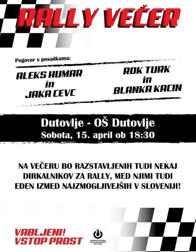 Teden dni pred začetkom letošnje sezone državnega prvenstva v reliju, bomo na rally večeru, ki bo potekal na velikonočno soboto v osnovni šoli Dutovlje, gostili najhitrejša voznika relija iz lanske sezone. Državnega prvaka - Idrijčana Aleksa Humarja z sovoznikom Jako Cevcem ter njegovega someščana Roka Turka z sovoznico Blanko Kacin.