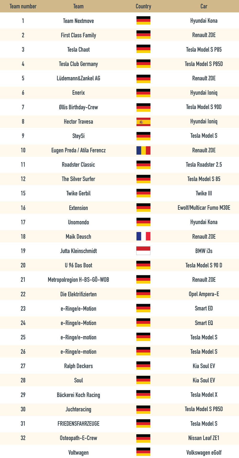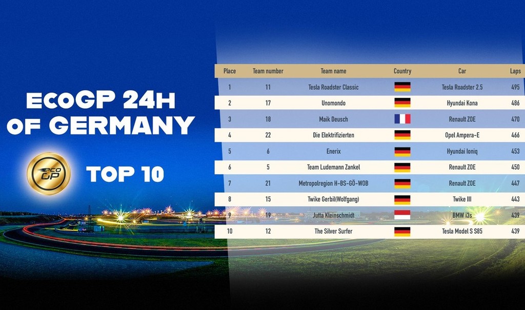 Na prvi tovrstni preizkušnji se je pomerilo 32 ekip z različnimi električnimi avtomobili (celoten seznam udeleženih najdete v priponki), zmaga pa je pripadla nemški ekipi Roadster Classic, ki se je udeležila dirke z že rahlo ostarelim predstavnikom (roadster 2.5) znamke Tesla Motors, ki so ga Američani zasnovali na osnovi konvencionalno gnanega serijskega izdelka znamke Lotus in ga izdelovali od leta 2007 do leta 2010. Edini pravi predstavnik športnih avtomobilov na tej dirki je v 24. urah prevozil natanko 495 krogov (več kot 1000 prevoženih kilometrov, seveda ne s samo enim polnjenjem akumulatorjev), na drugo mesto se je uvrstil hyundai kona (486 prevoženih krogov), tretji je kompaktni renault ZOE, ki se lahko pohvali z najbolj množično udeležbo med deseterico najbolje uvrščenih avtomobilov, ker so se med prvih deset uvrstili trije 'simpatični francozi', ki se lahko v teh dneh pohvalijo z novim prodajnim rekordom v Nemčiji, kjer je ZOE itak že dolgo številka 1 med najbolje prodajanimi električnimi avtomobili.