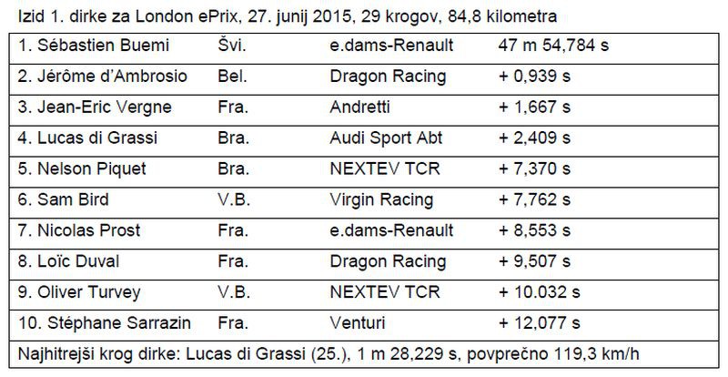 Ob prihodu v London je imelo moštvo e.dams-Renault znatno prednost v skupni razvrstitvi in je bilo edino, čigar oba dirkača sta še imela možnost osvojiti naslov prvaka. Med prostim treningom sta se oba uvrstila med prvih deset in nato med prvih šest, v sobotnih kvalifikacijah pa je prevladoval Sébastien Buemi. Dirka se je začela za varnostnim avtomobilom, ko pa se je ta ob koncu prvega kroga umaknil, je Švicar ostal v vodstvu in svojo prednost postopoma še krepil. Ob tem je bil uspešnejši od tekmecev za naslov prvaka tudi pri porabi energije.