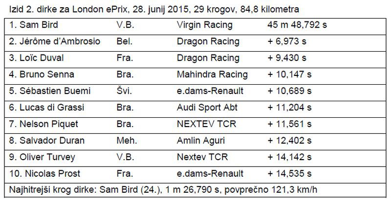 V kvalifikacijah, ki jih je prekinil dež, je prvo startno mesto osvojil Stéphane Sarrazin (Venturi). Sébastien Buemi je dirko začel s šestega mesta, pred obema tekmecema za naslov prvaka; di Grassi je bil na enajstem in Piquet na šestnajstem mestu. V dirki je Sarrazin vodil vse do cilja, v katerega je pripeljal s praznim akumulatorjem in zaradi prekoračene porabe energije dobil kazenski časovni pribitek. Zmagovalec dirke je bil tako domačin Sam Bird, a je pozornost pritegoval boj za prvaka, ki je potekal za njim. Buemi je bil na polovici dirke, ko dirkači opravljali obvezne zamenjave dirkalnikov, na petem mestu in s tem na dobri poti, da osvoji prvenstvo. Vendar se je v prvem krogu po prihodu iz boksa zasukal in izgubil eno mesto. Kljub vztrajnim poskusom, da bi se spet prebil naprej, Švicar ni mogel najti poti mimo Bruna Senne. Nelson Piquet je v cilj pripeljal sedmi in naslov prvaka osvojil z eno samo točko prednosti.