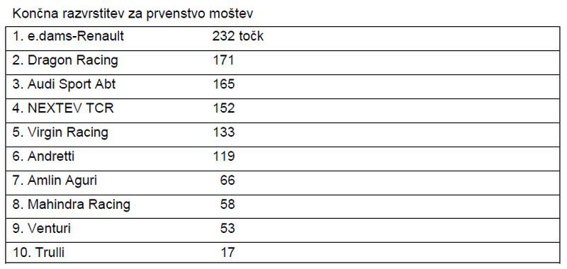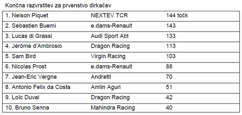 O naslovu prvaka FIA formule E med dirkači je odločala zadnja dirka, ki je bila minulo nedeljo v Londonu. V njej je zmagal Sam Bird (Virgin Racing), naslov prvaka pa je osvojil Nelson Piquet (Nextev TCR). Dirkača moštva e.dams-Renault Sébastien Buemi in Nicolas Prost sta v končni razvrstitvi prvenstva osvojila drugo oziroma šesto mesto. Dirkači in moštva se bodo zdaj posvetili pripravam na začetek druge sezone te nove formule, ki se bo začela jeseni z dirko v Pekingu.