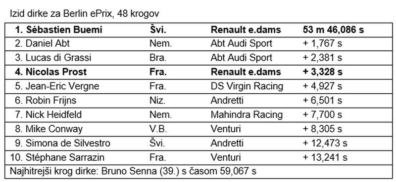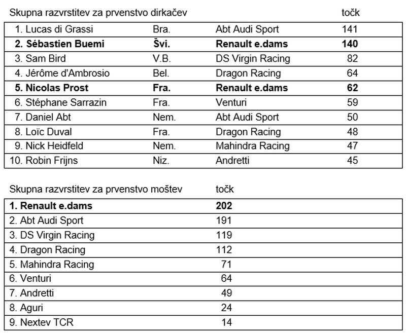 Moštvo Renault e.dams je odlično opravilo z dirko za Berlin ePrix, saj je prepričljivo zmagal Sébastien Buemi, dobro pa se je odrezal tudi Nico Prost s četrtim mestom. To je prineslo povečano prednost na vrhu skupne razvrstitve moštev. Buemi je hkrati svoj zaostanek za vodilnim v skupni razvrstitvi dirkačev po osmih dirkah zmanjšal na eno samo točko.