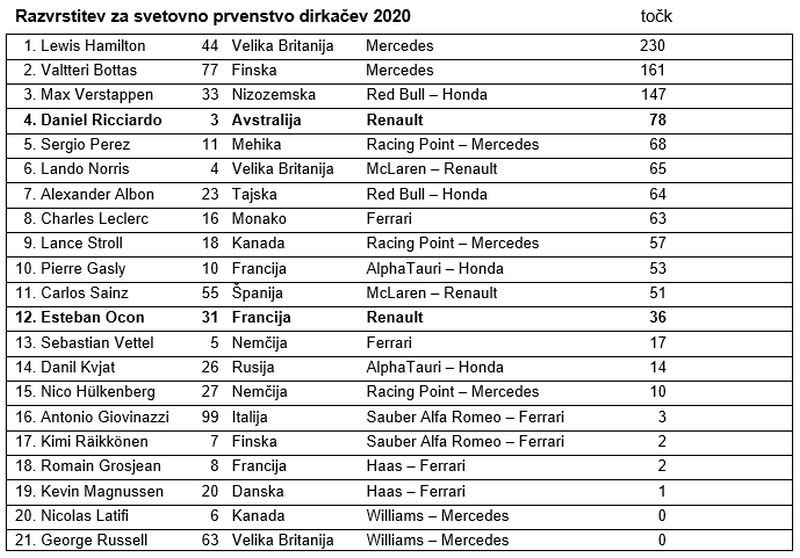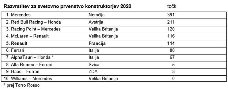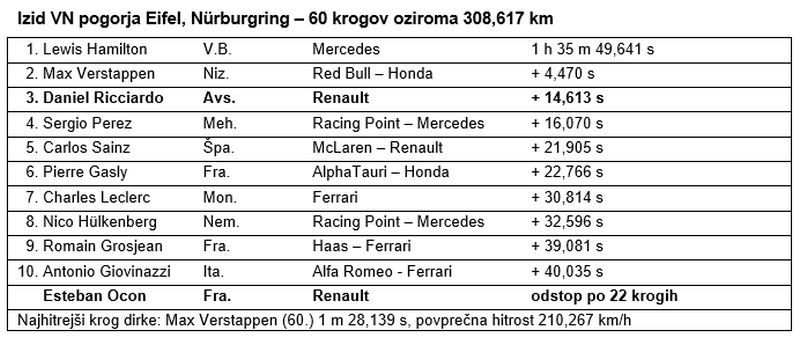 Moštvo Renault DP World F1 je v razburljivi dirki na Nürburgringu doseglo prvo uvrstitev na zmagovalni oder SP formule 1 od svoje vrnitve leta 2016. Z odličnim tretjim mestom Daniela Ricciarda se je tovarniško moštvo Renaulta po desetih letih odsotnosti vrnilo na stopničke. Ricciardo je bil v kvalifikacijah in na startu šesti, v dirki napredoval za tri mesta in si po izvrstnem boju na stezi uvrstitev na tretjo stopničko za volanom Renaulta R.S.20 prislužil z le malenkost več kot 1,4-sekundno prednostjo.