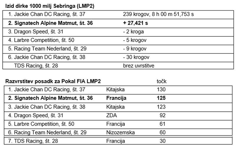 • V dirki 1000 milj Sebringa so dirkači Nicolas Lapierre, André Negrão in Pierre Thiriet z Alpine A470 po dobrih osmih urah dirkanja osvojili drugo mesto z manj kot 28 sekundami zaostanka za zmagovalci razreda LMP2.