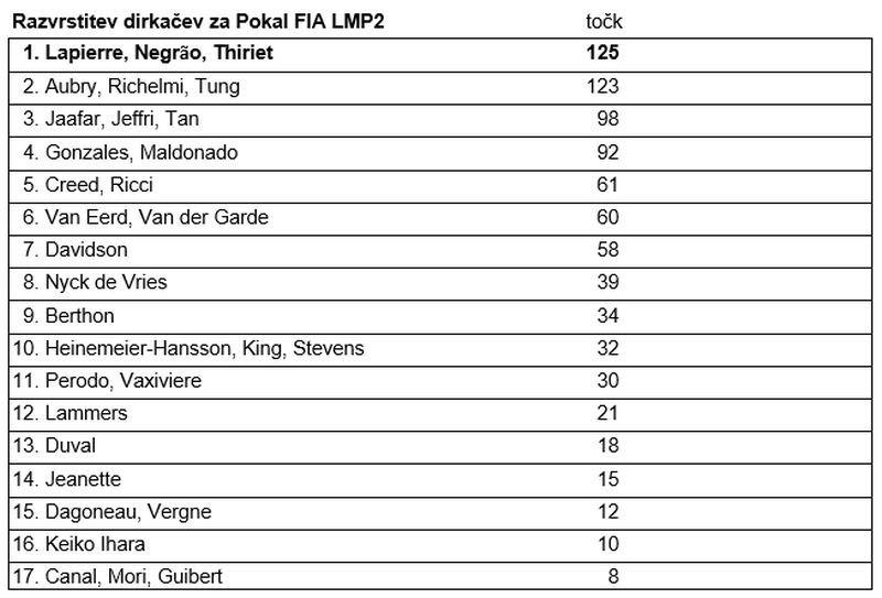 • S tem so v skupni razvrstitvi napredovali na prvo mesto, Signatech Alpine Matmut pa je v skupni razvrstitvi razreda LMP2 za svetovno vzdržljivostno prvenstvo (FIA WEC) še naprej na drugem mestu.