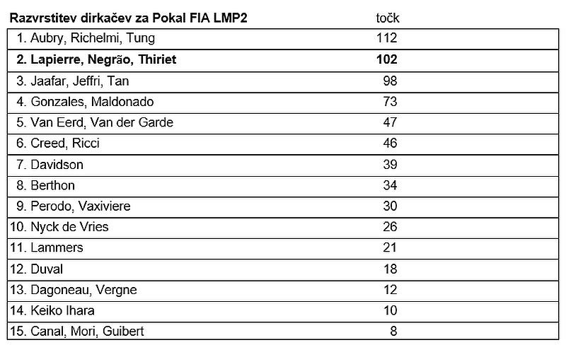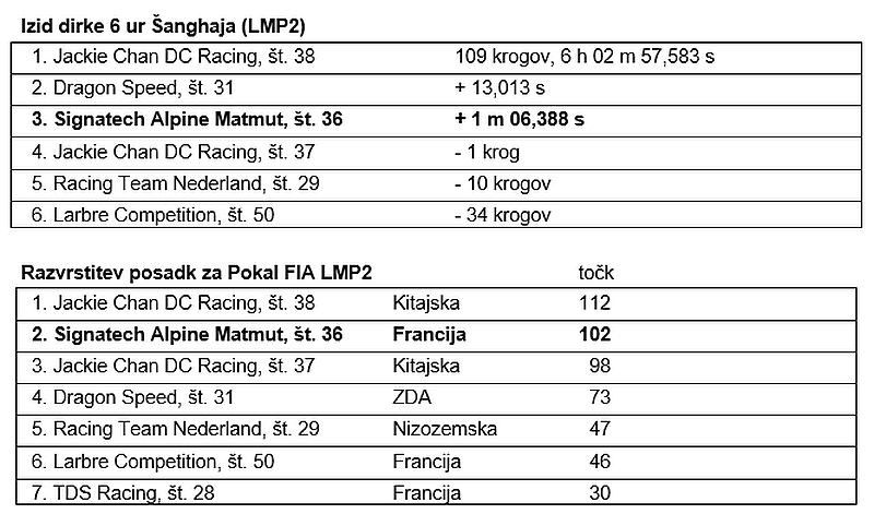 • Po koncu zaradi slabih razmer razkosane dirke na Kitajskem je moštvo Signatech Alpine Matmut v skupni razvrstitvi razreda LMP2 za svetovno vzdržljivostno prvenstvo (FIA WEC) na drugem mestu.