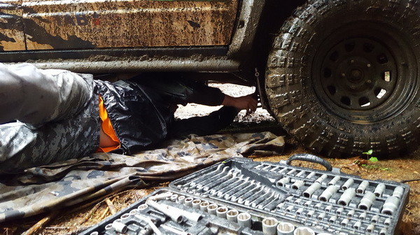 12 kilometrov pred ciljno linijo zaslišimo ropot v podvozju enega od naših jeepov. Ustavimo. Mehanika Sandi in Janez hitro postavita kruto diagnozo: odlom nosilca desnega zadnjega kolesa in odpad zadnje pogonske gredi. Vsem je zastal dih. V mislih se je odvil drugačen scenarij in na kratko smo podvomili o uspešnem zaključku. Ne. Predaleč smo, moramo najti rešitev! Debatiramo o možnosti vlečenja okvarjenega avtomobila. A to bi pomenilo njegovo popolno uničenje in nevozno stanje. Ostane le še poskus popravila. Z vitlom avto deloma dvignemo na bližnje drevo. Sandi in Janez se ponovno zakoljeta v blatna tla, pod podvozje, Gregor pa razstavlja nekaj rezervnih delov iz prtljažnika. Sledile so dolge minute negotovosti. Mehanika sta občasno zaklicala in izrazila željo po kakšnem vijaku ali orodju. Vedel sem, da nekaj improvizirata in prevezujeta s trakovi. Končno se umazana izvijeta izpod koles. »Nadaljujmo, a le z minimalno hitrostjo,« zamrmra Janez.
