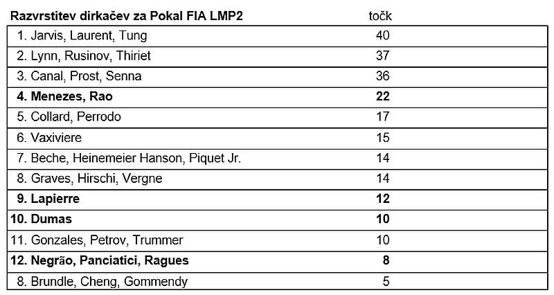 Gustavo Menezes: “Očitno sem razočaran, še posebno, ko pomislim na našo lansko zmago tu. Po dobrih kvalifikacijah smo menili, da se z ostalimi lahko merimo tudi v dirki, vendar smo iz raznih razlogov izgubili veliko časa. Smo moštvo, zato bomo morali skupaj ugotoviti, kaj je šlo narobe in se v najboljši formi lotiti dirke 24 ur Le Mansa.”