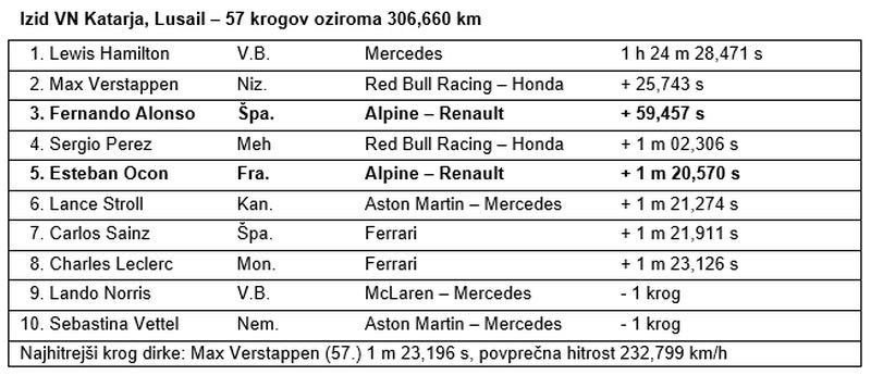 Alonso je tretje mesto moral prepustiti Sergiu Perezu preden je Mehičan s svojim drugim postankom Alonsu spet prepustil mesto za uvrstitev na stopničke. Navidezni poseg varnostnega avtomobila tik pred koncem dirke je Alonsu zagotovil dovolj prednosti, da je osvojil svojo prvo uvrstitev na zmagovalni oder z moštvom Alpine F1, drugo tako uvrstitev moštva v letošnji sezoni in 98. v njegovi karieri. Ocon je z bojevito vožnjo od starta do cilja napredoval za štiri mesta. Enako kot Alonso je Francoz dobro startal in napredoval na šesto mesto. Kloniti je moral pred hitrejšim Perezom, a se po svojem postanku in težavah drugih dirkačev spet povzpel nazaj na peto mesto. Na koncu je bil dober moštveni tovariš, ko je z upiranjem napadalnim dirkačem Alonsu varoval hrbet. Impresivna uvrstitev obeh dirkačev je moštvu Alpine F1 na petem mestu v skupni razvrstitvi konstruktorjev samo dve dirki pred koncem sezone zagotovila 25 točk prednosti.