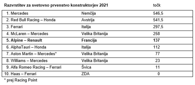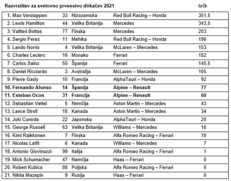 Esteban Ocon (9. startno mesto, 5. mesto v dirki): »Danes smo imeli krasno dirko in zelo sem zadovoljen, da sem po startu z devetega osvojil peto mesto. Po dobrem startu mi je uspelo prehiteti Carlosa [Sainza] in Jukija [Tsunoda]. Poskusil sem Fernandu vrniti njegovo uslugo iz Budimpešte; moštvo sem vprašal, če naj se branim pred Perezom. Imel je sveže pnevmatike in ni bilo lahko, a naredil sem, kar je bilo v mojih močeh. Današnji izid je za nas skoraj kot zmaga. Vsakdo v moštvu si zasluži pohvalo za ta fantastičen uspeh. Petindvajset točke pred moštvom AlphaTauri je lepa prednost pred zadnjima dirkama te sezone!«