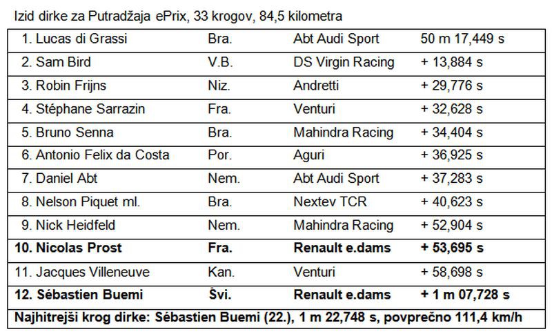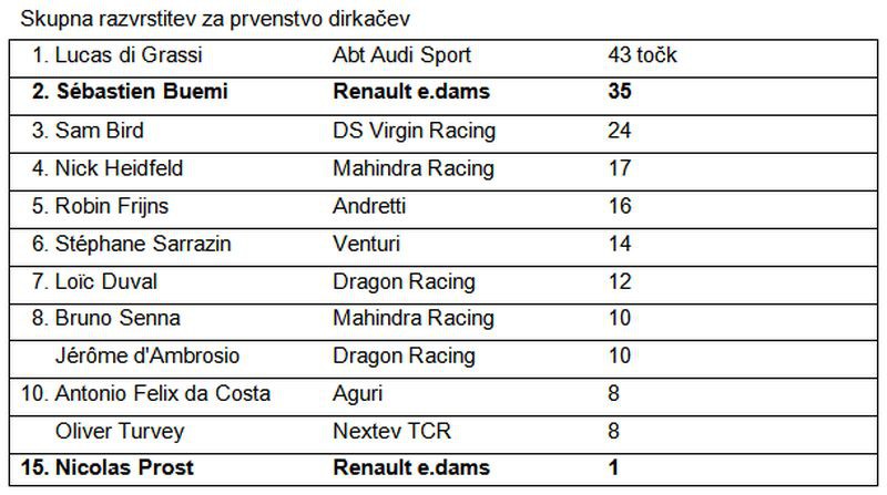 Prosti treningi in kvalifikacije so precej obetali, saj je Buemi že drugič zapored osvojil prvo startno mesto s skoraj pol sekunde prednosti, s tem pa tudi tri točke za prvenstvo. Prost je osvojil peto startno mesto. Ko so startne luči ugasnile, sta oba dirkača moštva Renault e.dams dobro speljala. Buemi je ostal na čelu, Prost pa se je boril v skupini neposrednih sledilcev za uvrstitev na stopničke. Francoz se je z impresivno vožnjo prebil na tretje mesto, potem pa moral zaradi težav, ki so verjetno posledica vpliva hude vročine na delovanje programske opreme, predčasno v boks na obvezno zamenjavo dirkalnika. Po vrnitvi v dirko se je prebil na čelo. Medtem ko je Prost peljal v boks, je Buemijev Z.E. 15 zaradi enakih težav obstal na stezi. Švicarju je kmalu uspelo, da ga je spet pognal in pripeljal v boks, kjer je presedel v drugi dirkalnik. Zaradi teh težav je Buemi zdrsnil na deveto mesto, potem pa je v prizadevanju, da nadoknadi izgubljeno, dosegel najhitrejši krog dirke (1:22,748) in s tem osvojil še dve točki.