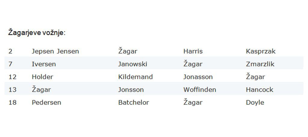 Izjemno zanimiv bo Žagarjev drugi nastop, ko ga v sedmi vožnji ob klubskih kolegih Zmarzliku in Dancu Niels Kristianu Iversenu čaka še aktualni poljski prvak Maciej Janowski. Neposreden dvoboj za tretje mesto v skupnem seštevku bo 13. vožnja, ko bosta za dobro mero ob Hancocku na startu še aktualni vodilni v SP Britanec Tai Woffinden ter Šved Andreas Jonsson.