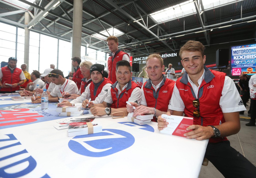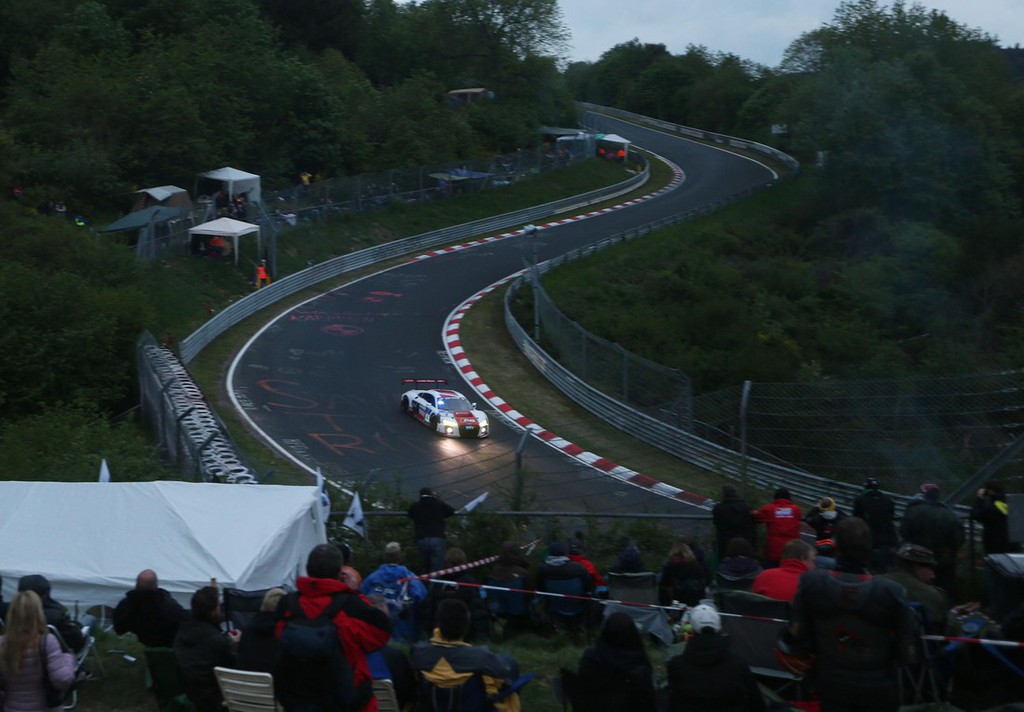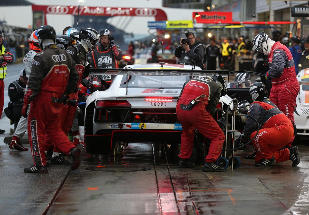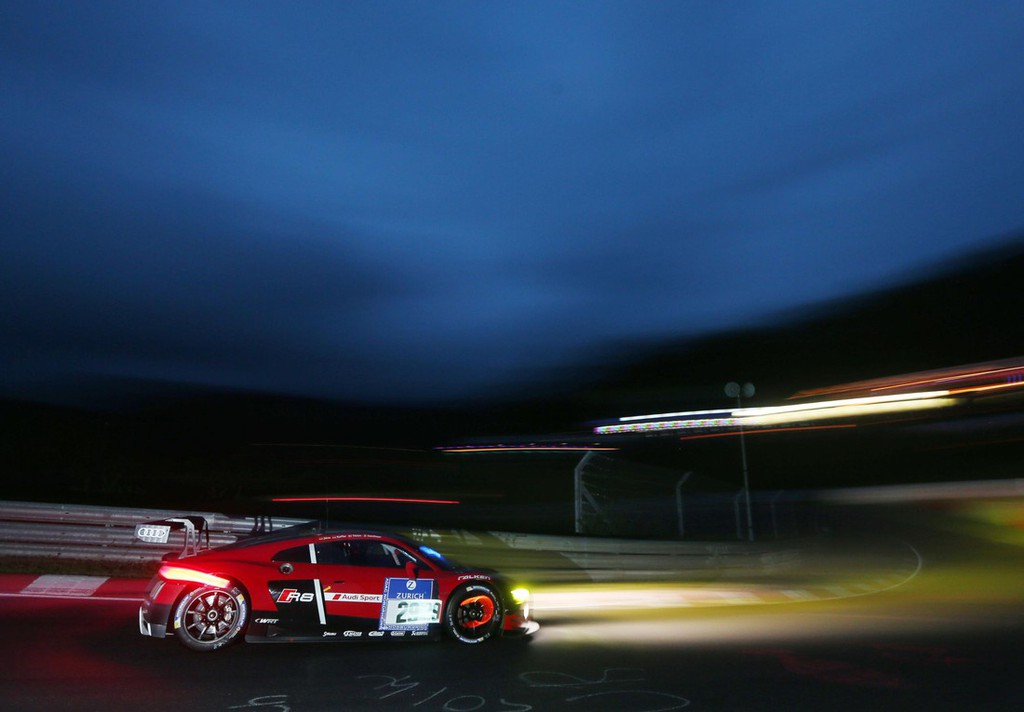 Okrog 50 odstotkov dirkalnika GT3 temelji na njegovem serijskem bratu, s katerim sta marca skupaj slavila premiero na avtomobilskem salonu v Ženevi. Na 24-urni dirki so bili na startu štirje novi Audiji R8 LMS. Lanski zmagovalci Christopher Haase/Christian Mamerow/René Rast/Markus Winkelhock so v dirkalniku s številko 1 ekipe Audi Sport Team Phoenix na dirki večkrat vodili, a so morali po nesreči Christiana Mamerowa odstopiti. Nemec je ostal na opazovanju v bolnišnici. Mike Rockenfeller se je z enakim Audijem s številko 4 tik pred polovico dirke zavrtel na od olja zamazani stezi. Eden od dirkalnikov za njim ga je zadel in pri tem prehudo poškodoval njegov Audi, s katerim nato ni bilo mogoče nadaljevati dirke.