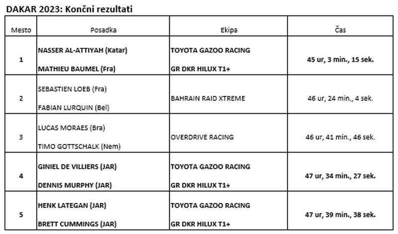 Dakar 2023 si bosta zapomnila tudi Henk Lategan in Brett Cummings, ki sta v skupnem seštevku že zasedala drugo mesto, a sta zaradi nekaterih nepredvidenih težav po lestvici zdrsnila nekoliko navzdol. Kljub temu sta dokazala, da sta uigran tandem, ki se odlično znajde v najbolj zahtevnih razmerah. V skupnem seštevku sta reli končala na petem mestu. Na letošnji izvedbi relija Dakar je tudi sicer prevladovala Toyota. Posadke TGR so končale na prvem, četrtem in petem mestu. Na tretje mesto sta se uvrstila mladi Brazilec Lucas Moraes in njegov sovoznik Timo Gottschalk, ki sta s poltovornjakom Hilux T1+ nastopala kot zasebnika.